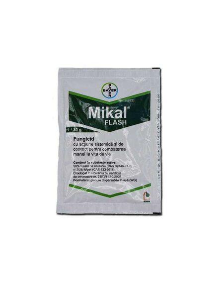 Mikal Flash are acţiune preventivă excelentă asupra ciupercilor patogene, împiedicând germinarea sporilor şi creşterea miceliului. Mikal Flash este unul dintre puţinele produse destinate combaterii manei care posedă sistemicitate completă ascendentă şi descendentă, translocându-se în creşterile noi, inclusiv la nivelul ciorchinelui în stadiu erbaceu. Prin modul de acţiune multi-site şi de stimulare a sistemului de autoapărare al plantei, Mikal Flash face imposibilă dezvoltarea fenomenului de rezistenţă. Acţiunea suplimentară de contact asigură o protecţie imediată faţă de toate rasele fiziologice cunoscute, înainte ca activitatea sistemică a produsului să se producă. Prin acest mecanism complex de acţiune, Mikal Flash asigură protecţia faţă de mană în momentele de sensibilitate maximă ale viţei de vie.