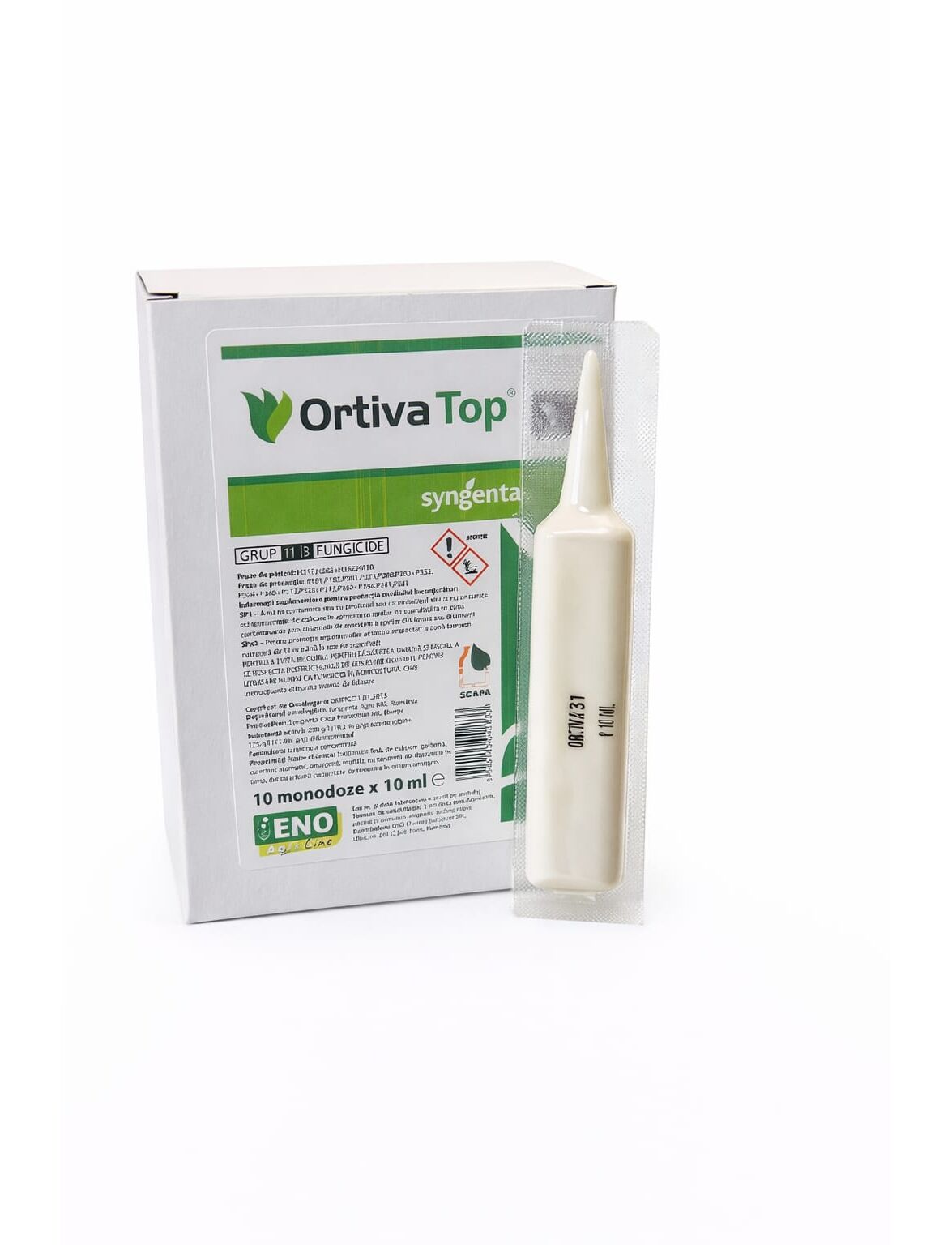 Ortiva Top contine doua ingrediente active (azoxistrobin si difenoconazol) cu activitate de contact si sistemica locala şi translaminara. Azoxistrobin: Actioneaza ca inhibitor al respiratiei mitocondriale, blocand ciclul energetic al patogenului. Intervine in ciclul biologic al ciupercii, in principal in timpul germinatiei sporilor si in timpul initierii penetrarii in tesuturile plantei. Prezinta preluare graduala si activitate sistemica locala (translaminara) in frunze. Activitate preventiva. Difenoconazol: Prezinta actiune preventiva si curativa. Actioneaza prin blocarea biosintezei steroizilor in membranele celulare ale fungilor. Actiune sistemica locala si usoara translocare acropetala.