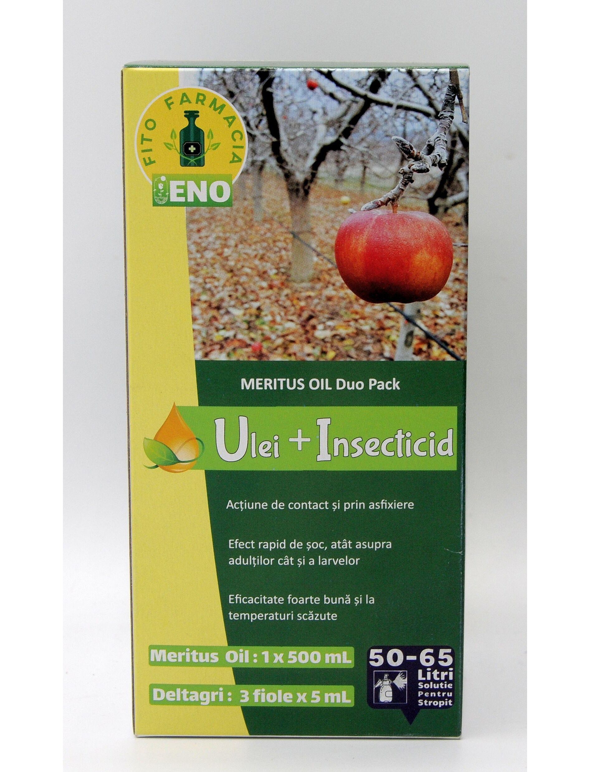 • MERITUS OIL – 1 x 500 ml: ulei horticol mineral de înaltă puritate, care acționează prin asfixiere mecanică asupra dăunătorilor și îmbunătățește aderența soluției de stropit.