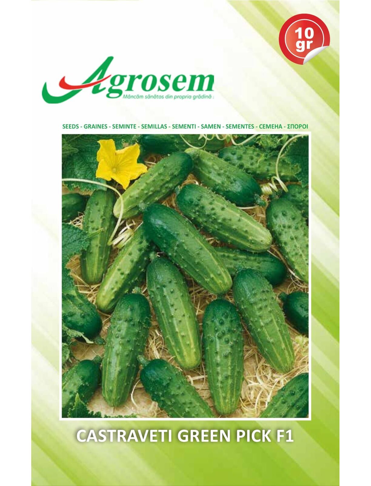 Castraveti Green Pick, este un hibrid semitimpuriu de castraveti de tip cornichon cu flori predominant femele. Fructul este cilindric de lungime 5-6 cm si culoare verde inchis. Prezinta rezistenta la boli. Productii constante., este recomandat pentru cultura in camp. Ambalaj: plic 5 gr