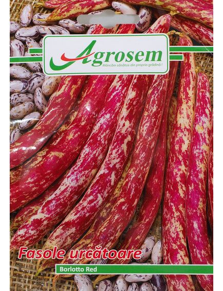 BORLOTTO RED este un soi tardiv de fasole urcătoare cu creștere viguroasă, foarte apreciat pentru productivitatea ridicată și aspectul decorativ al păstăilor. Planta dezvoltă vrejuri puternice, ce pot atinge 250–300 cm, având păstăi lungi, roșii cu dungi crem-roșiatice și boabe ovale, de culoare roz cu marmorări roșii.