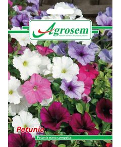 Descriere produs: Petunia Nana este o varietate ornamentală de petunie anuală pitică, cu flori mari, intens colorate, în nuanțe variate de alb, roz, roșu, violet și mov. Plantele formează tufe compacte, cu înălțimea de 20–30 cm, având o înflorire abundentă și de lungă durată. Datorită...