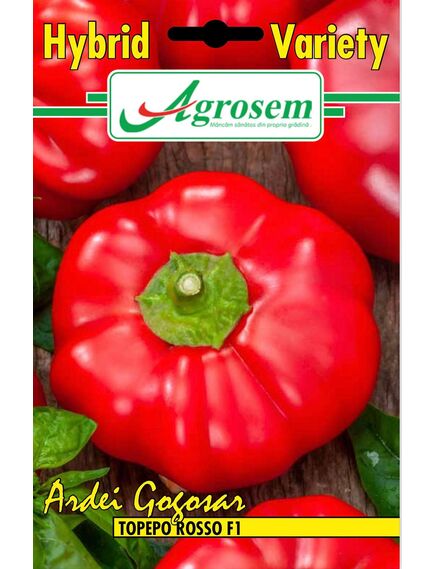 Topepo Rosso F1 este un hibrid de ardei tip gogoșar, recunoscut pentru fructele sale mari, turtite, cu formă regulată și culoare roșu intens la maturitate. Pulpa este foarte groasă, cărnoasă și suculentă, cu gust dulce plăcut. Fructele au greutate ridicată și aspect comercial excelent, fiind ideale pentru consum în stare proaspătă, gătit și conserve. Planta este viguroasă, cu port compact, foarte productivă și adaptată atât culturii în câmp, cât și în spații protejate.